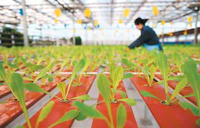 农民在河北省迁西县五海生态观光园内管护无土栽培蔬菜秧苗。新华社记者 牟 宇摄