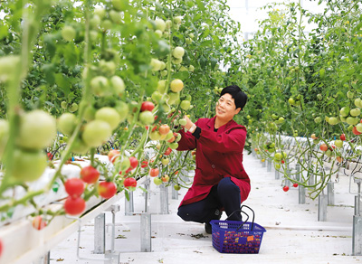 浙江省台州市路桥区螺洋街道5G智慧农业产业园“植物工厂”内,工作人员在采摘水果番茄。蒋友青摄(人民图片)