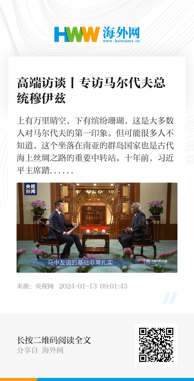 穆伊兹:非常感谢你的提问,这是个很好的问题,很多人都这么问我。我想说,首先,我非常荣幸并感谢习近平主席邀请我作为2024年首位访华的国家元首,这显示了我们两国之间的重要合作关系和深厚友谊。对我来说,正如你提到的那样,自从我去年11月就任总统以来,中国是我进行国事访问的第一个国家。我感到非常高兴,也非常荣幸,十分感谢习近平主席和中国政府。