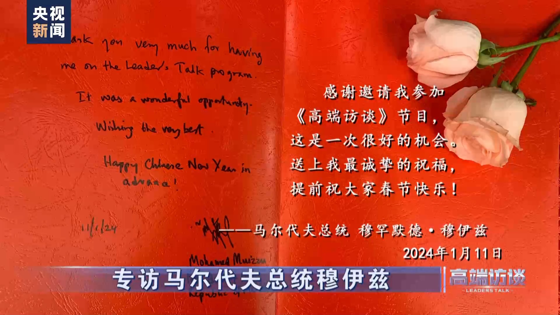 △马尔代夫总统穆伊兹在接受总台专访后题词