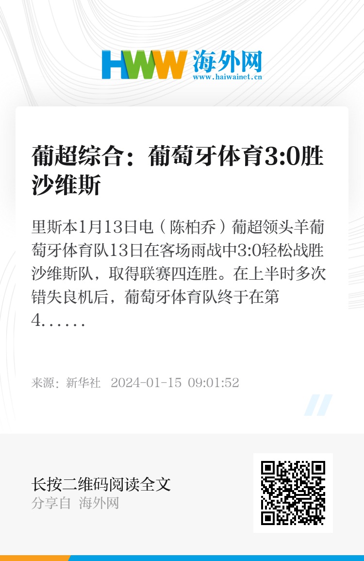 新华社里斯本1月13日电(陈柏乔)葡超领头羊葡萄牙体育队13日在客场雨战中3:0轻松战胜沙维斯队,取得联赛四连胜。