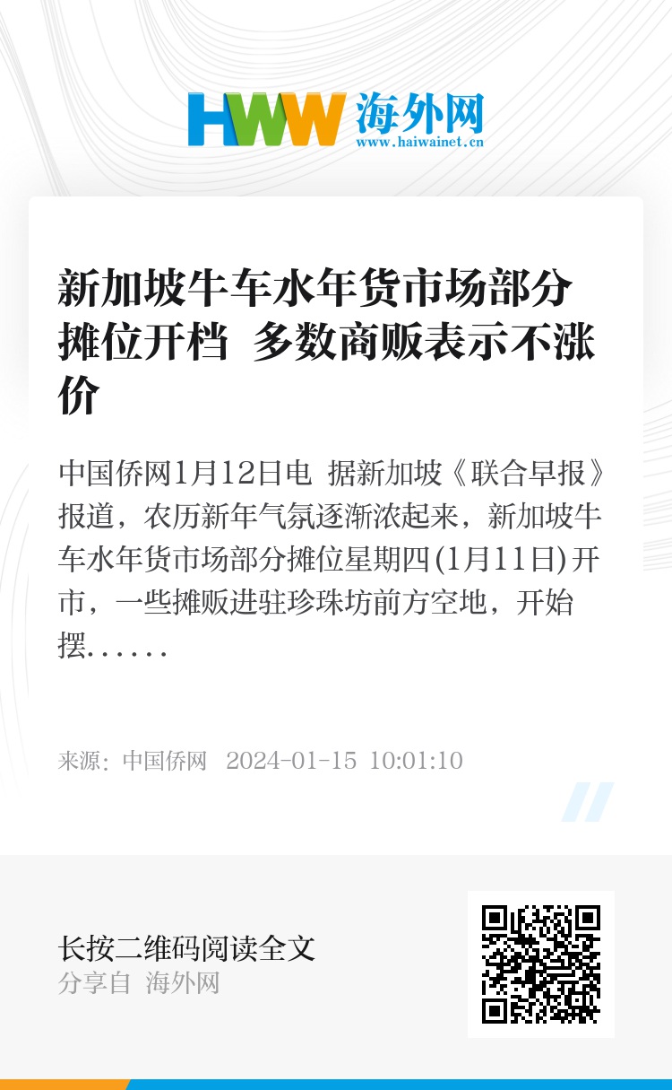 中国侨网1月12日电 据新加坡《联合早报》报道,农历新年气氛逐渐浓起来,新加坡牛车水年货市场部分摊位星期四(1月11日)开市,一些摊贩进驻珍珠坊前方空地,开始摆卖年货。受访商贩说,今年商品价格与去年一样,希望能够带来更多销量。