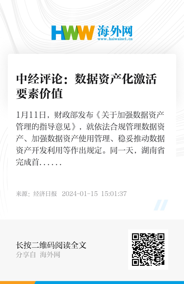 1月11日,财政部发布《关于加强数据资产管理的指导意见》,就依法合规管理数据资产、加强数据资产使用管理、稳妥推动数据资产开发利用等作出规定。同一天,湖南省完成首笔数据资产无抵押融资,某科技公司获得银行500万元授信额度。数据资产这一新兴资产类型,在经济运行中日益活跃。