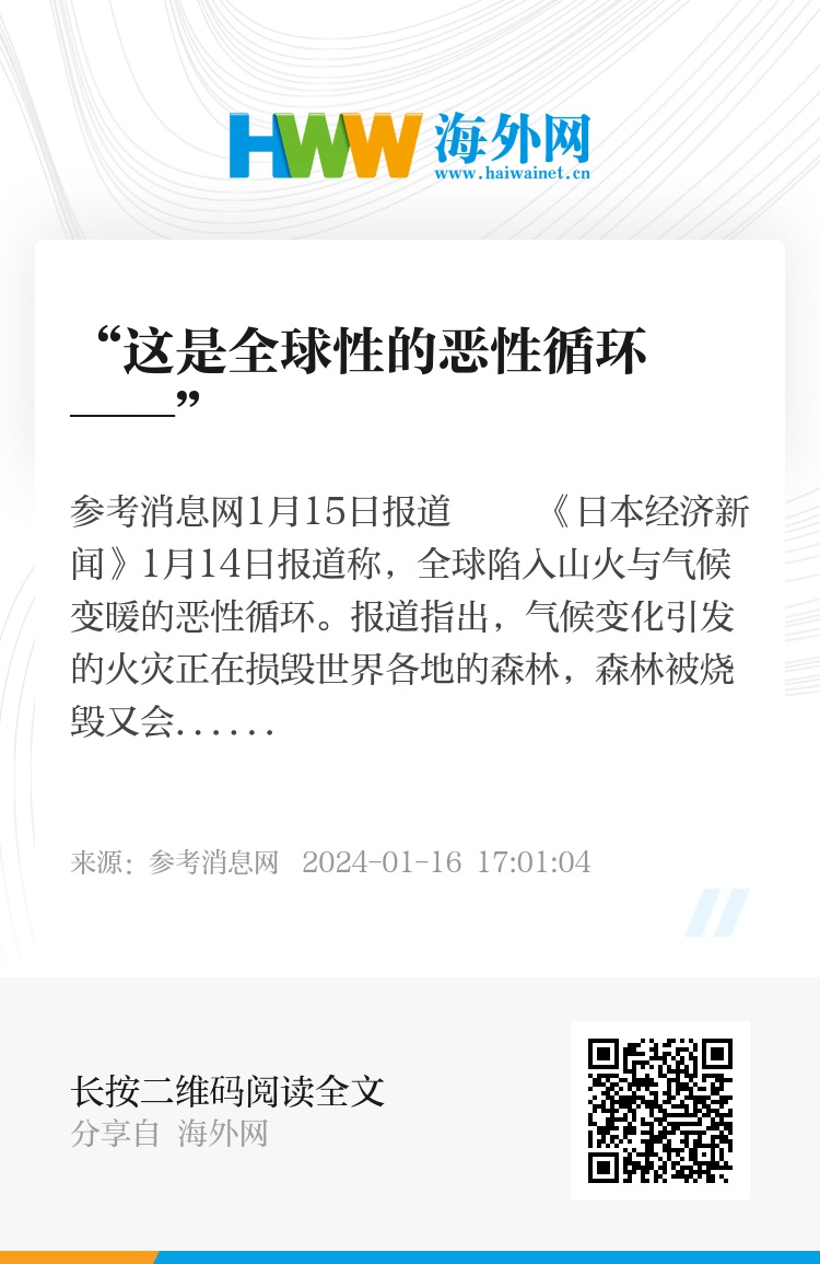 参考消息网1月15日报道 《日本经济新闻》1月14日报道称,全球陷入山火与气候变暖的恶性循环。