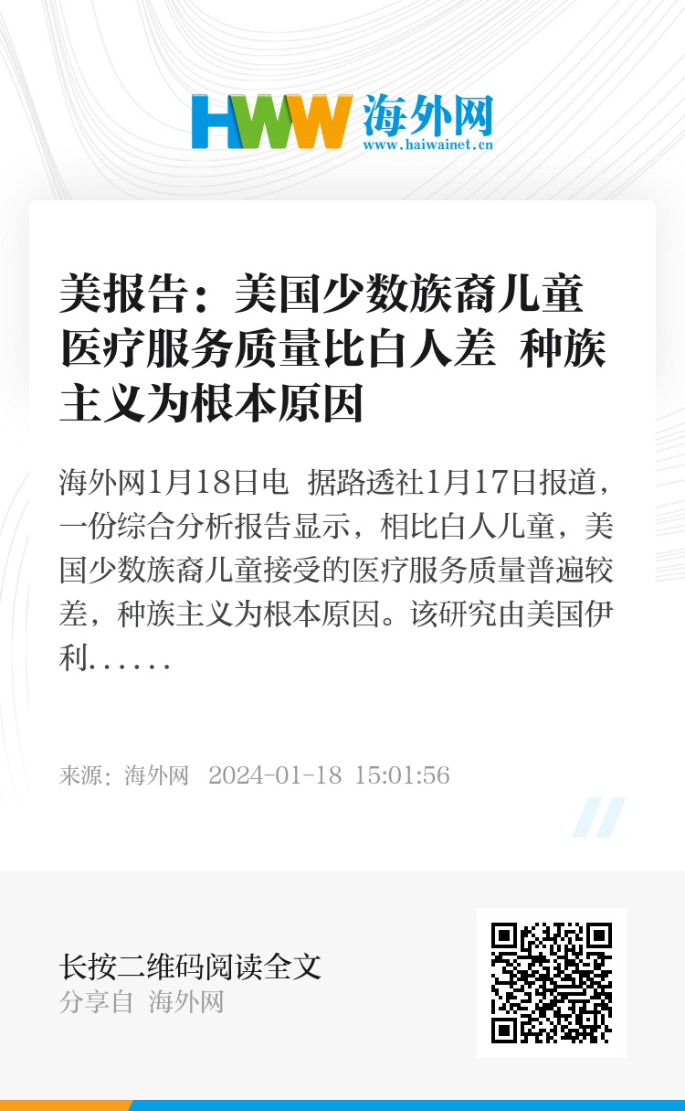 海外网1月18日电 据路透社1月17日报道,一份综合分析报告显示,相比白人儿童,美国少数族裔儿童接受的医疗服务质量普遍较差,种族主义为根本原因。