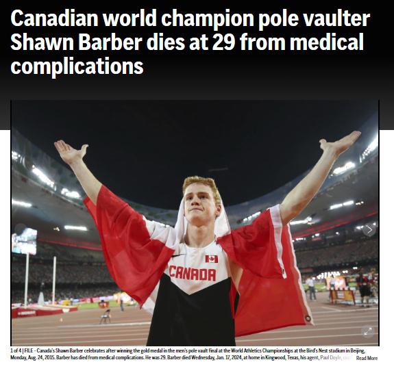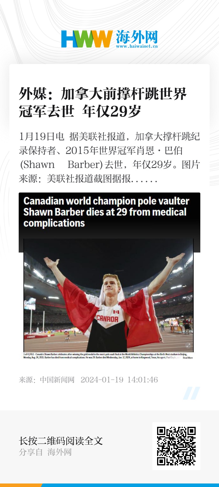 中新网1月19日电 据美联社报道,加拿大撑杆跳纪录保持者、2015年世界冠军肖恩·巴伯(Shawn Barber)去世,年仅29岁。