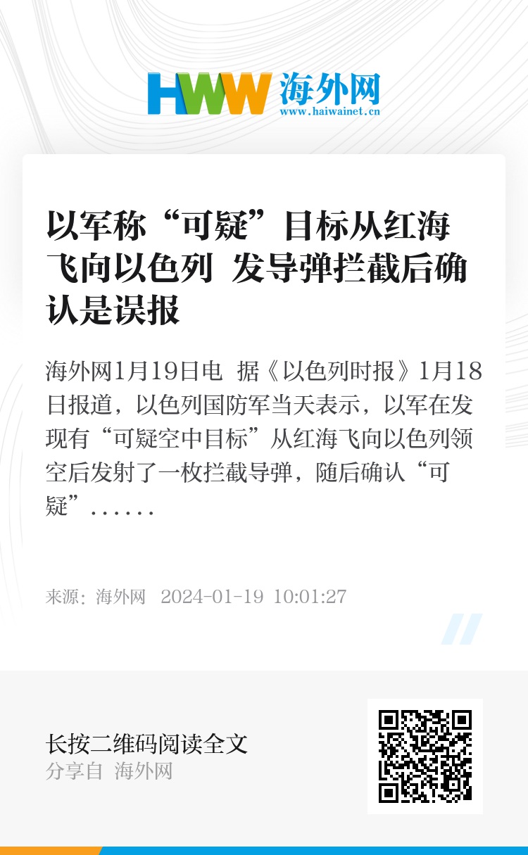 海外网1月19日电 据《以色列时报》1月18日报道,以色列国防军当天表示,以军在发现有“可疑空中目标”从红海飞向以色列领空后发射了一枚拦截导弹,随后确认“可疑”目标系误报。