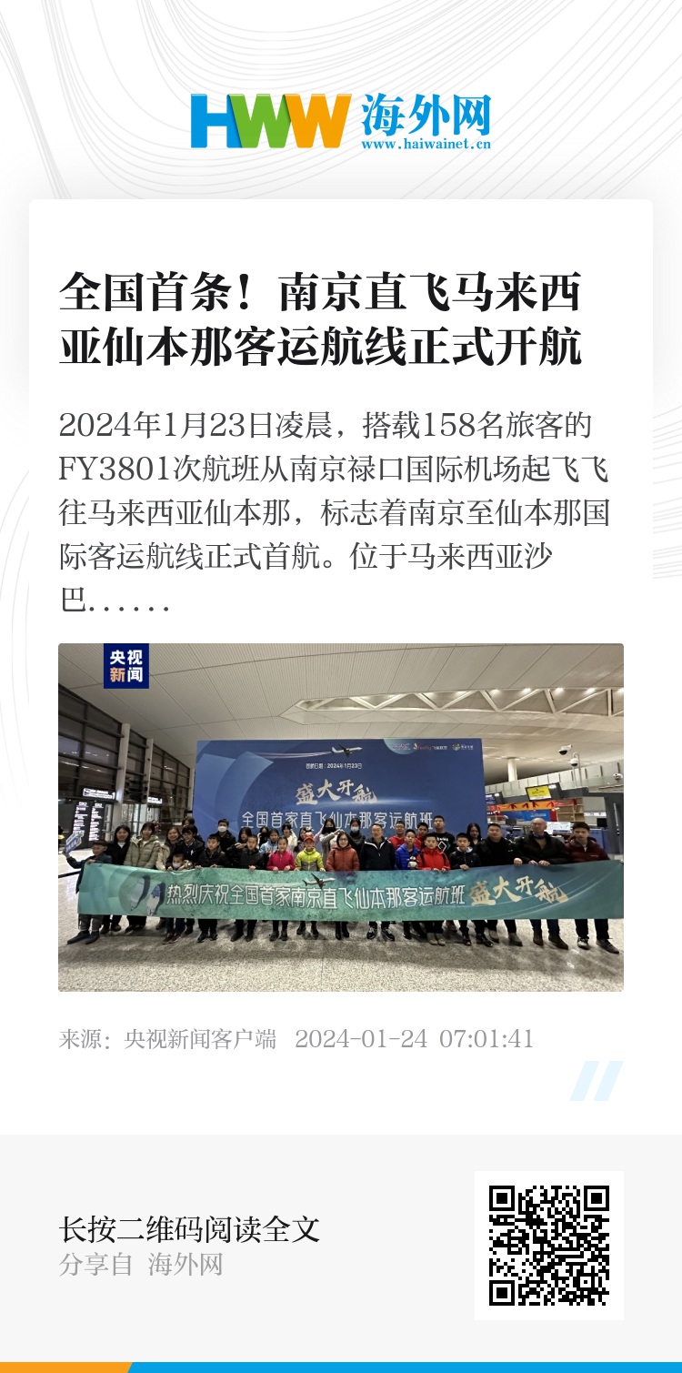 2024年1月23日凌晨,搭载158名旅客的FY3801次航班从南京禄口国际机场起飞飞往马来西亚仙本那,标志着南京至仙本那国际客运航线正式首航。