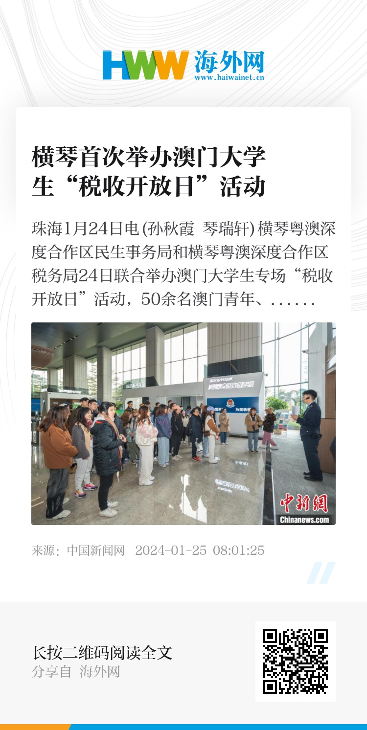 中新网珠海1月24日电(孙秋霞 琴瑞轩)横琴粤澳深度合作区民生事务局和横琴粤澳深度合作区税务局24日联合举办澳门大学生专场“税收开放日”活动,50余名澳门青年、高校学子走近税务,了解内地税法知识、合作区税收优惠政策和税费征管服务等。