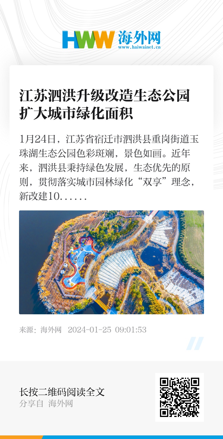 1月24日,江苏省宿迁市泗洪县重岗街道玉珠湖生态公园色彩斑斓,景色如画。近年来,泗洪县秉持绿色发展,生态优先的原则,贯彻落实城市园林绿化“双享”理念,新改建10处口袋公园,5大综合公园,7处专类公园,10条滨河风光带,36个街头绿地及社区游园,并对玉珠湖生态公园、尾水湿地生态公园实施升级改造,百姓获得感、幸福感显著增强。图片来源:视觉中国