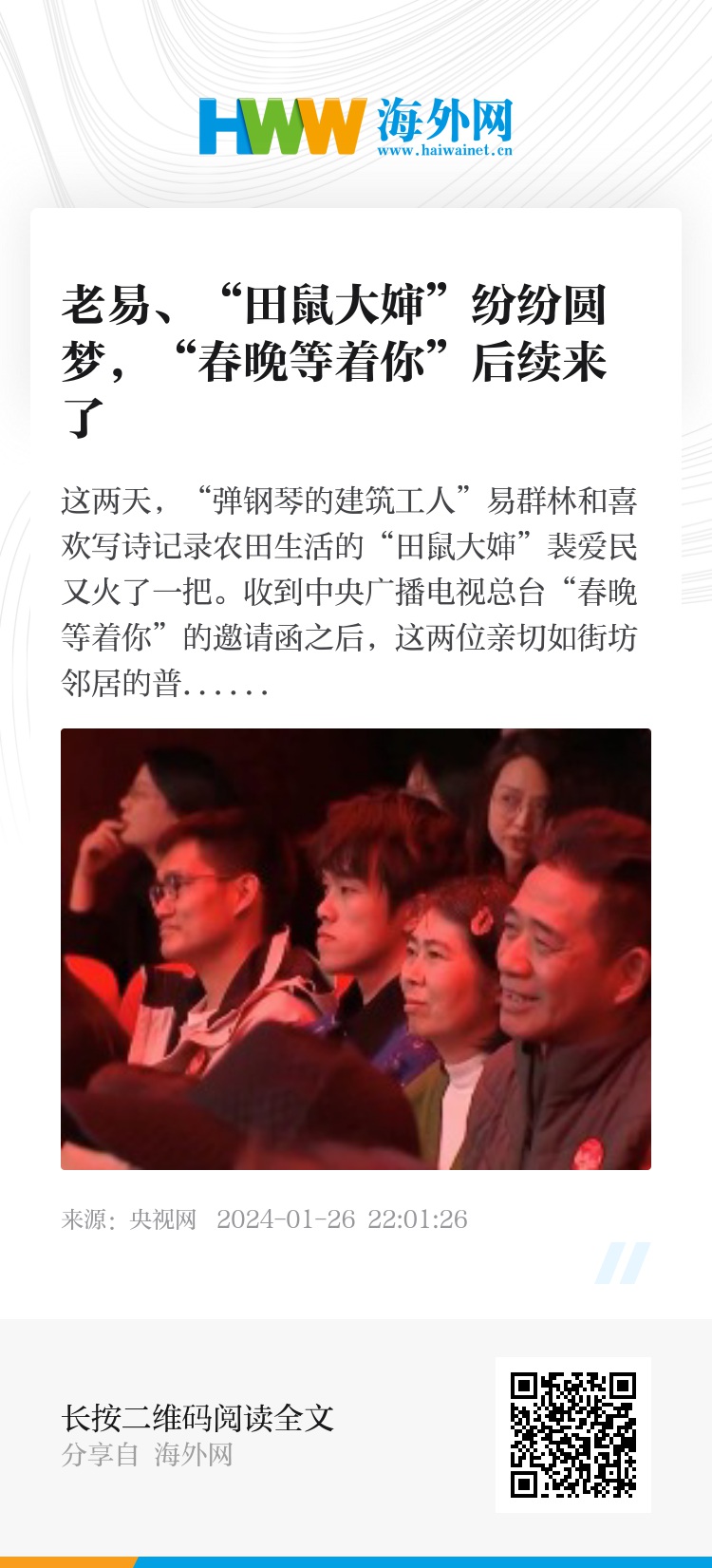 这几天,#郎朗回应58岁建筑工人钢琴之约#登上微博热搜榜第1位,#58岁弹钢琴的工人大叔受邀看春晚##土豆苞米的故事她写了20万字##50岁田鼠大婶在线更新春晚日记##50岁农民诗人接春晚邀约心怦怦跳#等话题登上多平台热搜,人民日报、光明日报、学习强国、共青团中央、中国日报、中国青年报、中国妇女、中国妇女报等官方媒体陆续跟进报道。