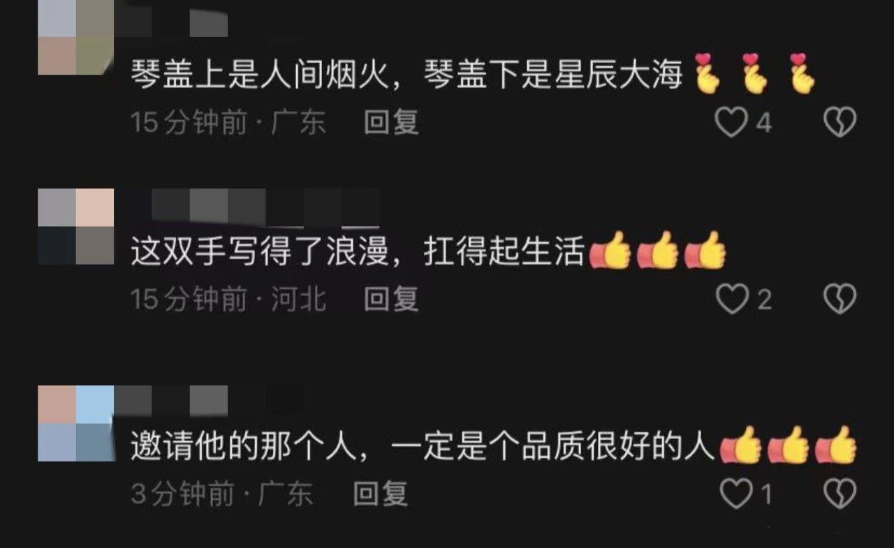 当一位普通人实现了自己的愿望,网友们替老易开心,“你开心我们也开心,因为你代表我们普通老百姓”。有人妙语连珠,留下对老易追梦的金句点评,“扛得起生活,也弹得了浪漫”“可筑神州大厦,可谱华夏乐章”“一手是生活,一手是梦想”。