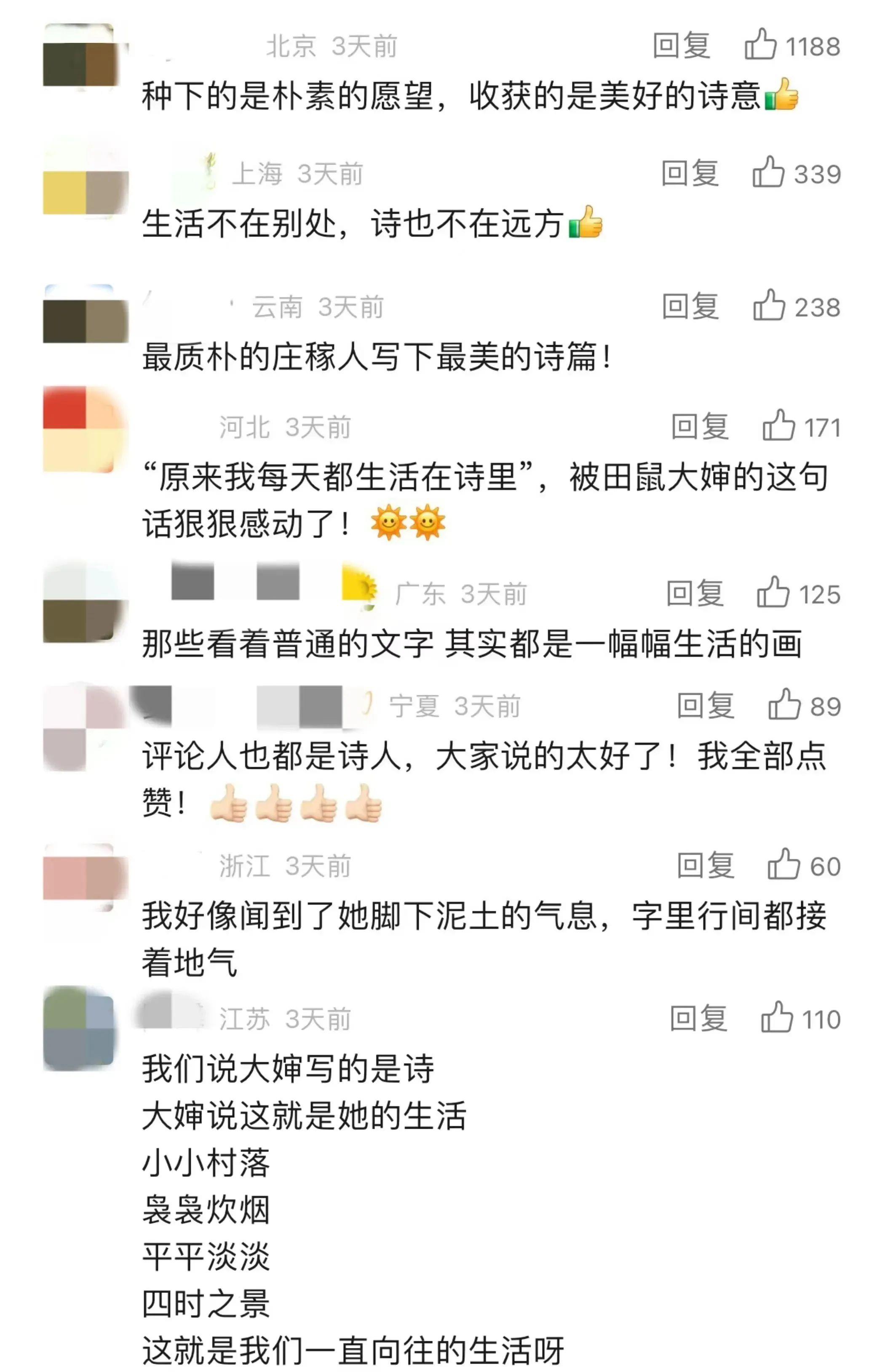 “田鼠大婶”的“观后感日记”开整了。几天前,“田鼠大婶”上春晚的消息和故事一经报道,网友们便纷纷留言交上了“观后感”。“种下朴素的愿望,收获美好的诗意”“生活不在别处,诗也不在远方”“那些看着普通的文字,其实都是一幅幅生活的画”……大家也变成了诗人,为大婶和她的土地点赞,诗意溢出评论区!