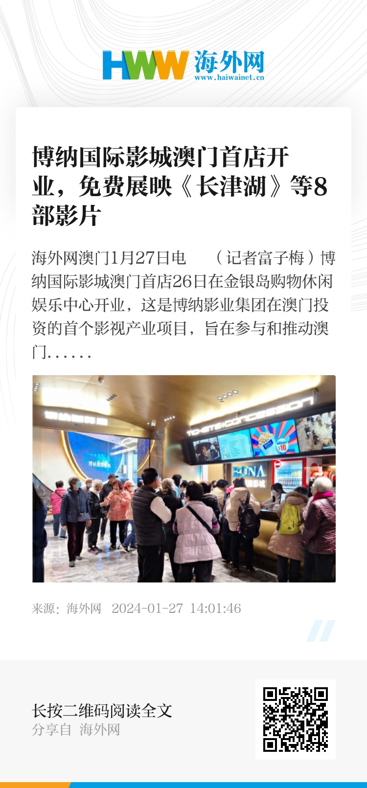 海外网澳门1月27日电 (记者富子梅)博纳国际影城澳门首店26日在金银岛购物休闲娱乐中心开业,这是博纳影业集团在澳门投资的首个影视产业项目,旨在参与和推动澳门适度多元发展,建设“演艺之都”。