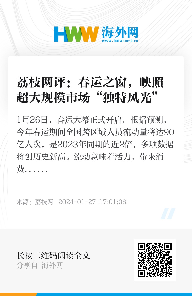 1月26日,春运大幕正式开启。根据预测,今年春运期间全国跨区域人员流动量将达90亿人次,是2023年同期的近2倍,多项数据将创历史新高。流动意味着活力,带来消费潜力。与春运相伴的,“2024全国网上年货节”正式拉开帷幕,活动将持续到2月17日。把春运与消费联系在一起,是看到了正在迸发的消费潜能。不仅交通运输部门做足准备,优化运能供给,满足人们出行需求,各地促消费场景也不断涌现“新意”,借势春运带来的“流动活力”,整合商家资源,推动线上线下“双向开弓”,让琳琅满目的“年货节”提前开摆,满足人们购物需求,让“乡愁”与“烟火气”彼此相融,带动“年味”升腾。