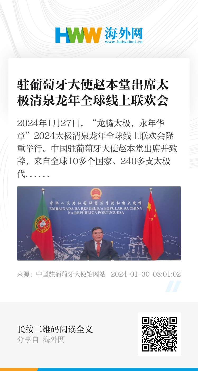 2024年1月27日,“龙腾太极,永年华章”2024太极清泉龙年全球线上联欢会隆重举行。中国驻葡萄牙大使赵本堂出席并致辞,来自全球10多个国家、240多支太极代表队参加活动并展现太极魅力。