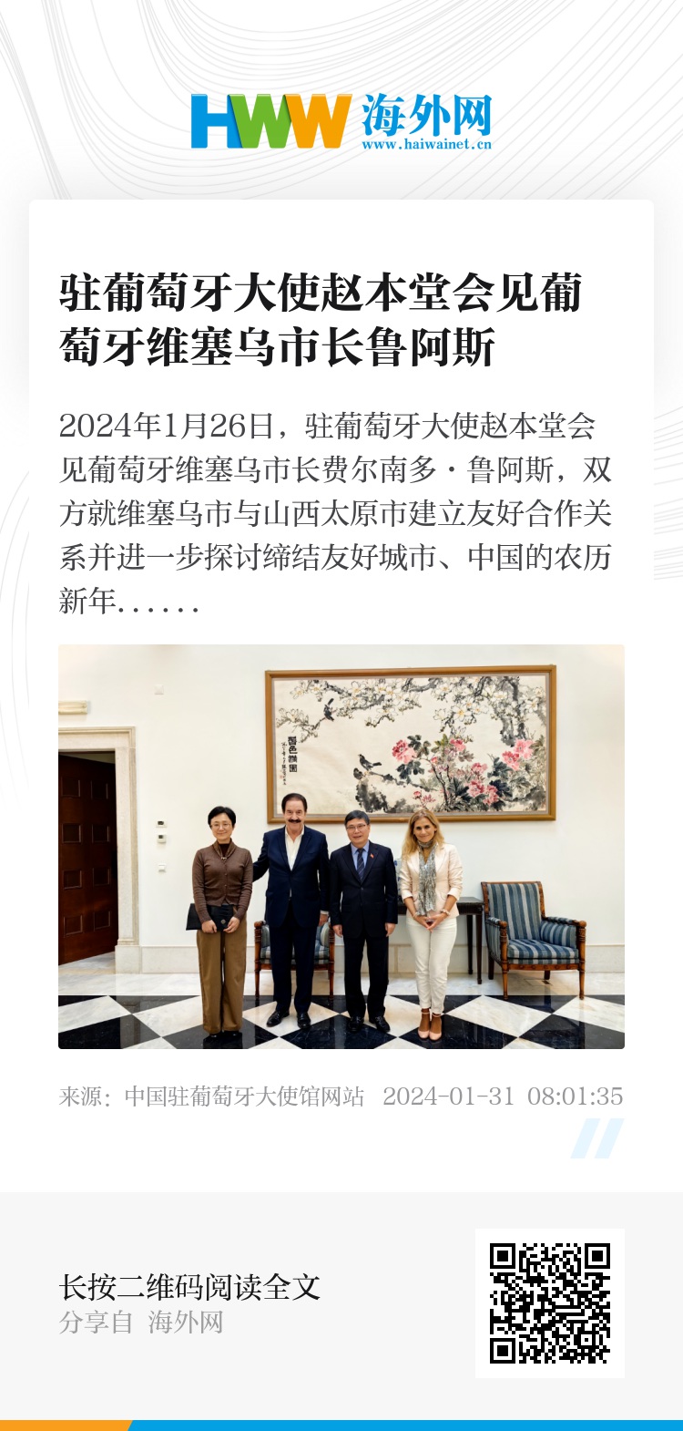2024年1月26日,驻葡萄牙大使赵本堂会见葡萄牙维塞乌市长费尔南多·鲁阿斯,双方就维塞乌市与山西太原市建立友好合作关系并进一步探讨缔结友好城市、中国的农历新年和维塞乌的圣马特乌斯节体现的不同文化特色和传统习俗,以及共同推动中国与维塞乌各领域交流与合作等议题交换意见。使馆主管经济商务事务参赞夏晓玲、维塞乌市政委员玛拉·阿尔梅达等出席。