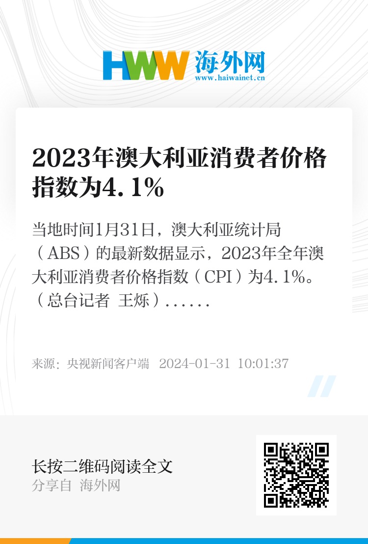 当地时间1月31日,澳大利亚统计局(ABS)的最新数据显示,2023年全年澳大利亚消费者价格指数(CPI)为4.1%。(总台记者 王烁)