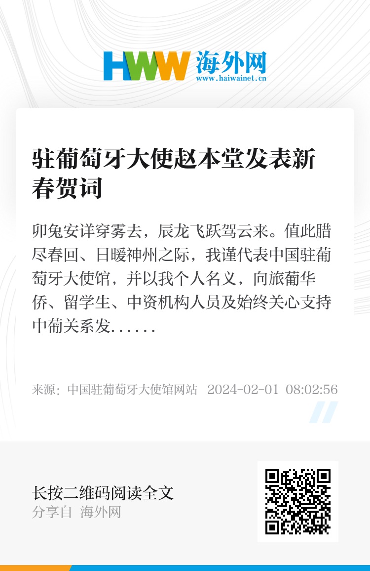 卯兔安详穿雾去,辰龙飞跃驾云来。值此腊尽春回、日暖神州之际,我谨代表中国驻葡萄牙大使馆,并以我个人名义,向旅葡华侨、留学生、中资机构人员及始终关心支持中葡关系发展的各界友人们致以诚挚的问候和美好的祝福!祝大家新春快乐、龙年大吉、阖家安康!