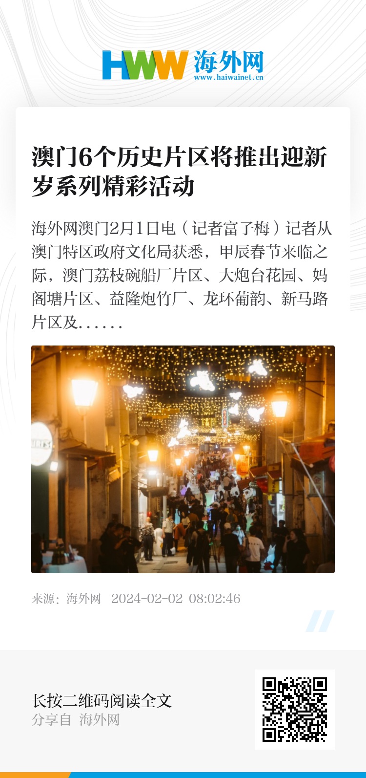 海外网澳门2月1日电(记者富子梅)记者从澳门特区政府文化局获悉,甲辰春节来临之际,澳门荔枝碗船厂片区、大炮台花园、妈阁塘片区、益隆炮竹厂、龙环葡韵、新马路片区及福隆新街步行区创新推出一系列精彩活动,与市民旅客欢度新春、共庆佳节,呈现龙年新气象。
