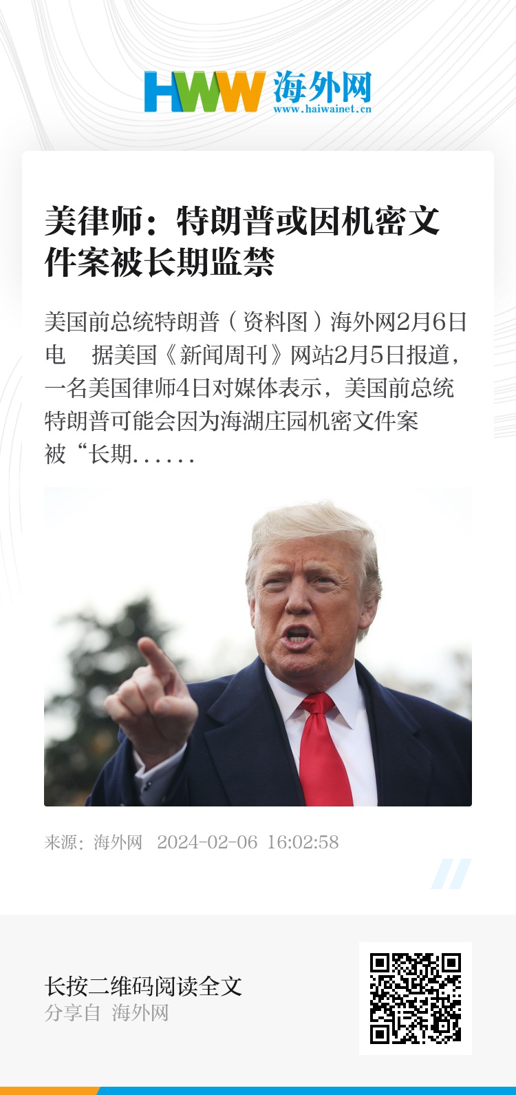海外网2月6日电 据美国《新闻周刊》网站2月5日报道,一名美国律师4日对媒体表示,美国前总统特朗普可能会因为海湖庄园机密文件案被“长期监禁”。
