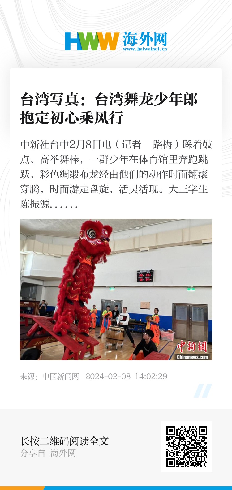 近日,中新社记者探访了位于台湾台中市的台湾体育运动大学(简称台体大)舞龙舞狮队。这支队伍的指导老师是该校体育学系副教授陈重佑,他在2002年组建舞龙舞狮队,既出于传承传统民俗技艺的使命感,也希望学生们有特色技能傍身,在就业时更具优势。