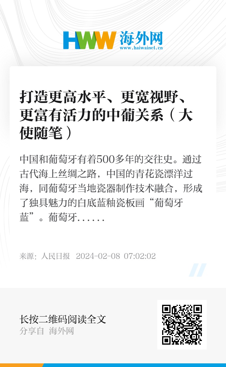 中国和葡萄牙有着500多年的交往史。通过古代海上丝绸之路,中国的青花瓷漂洋过海,同葡萄牙当地瓷器制作技术融合,形成了独具魅力的白底蓝釉瓷板画“葡萄牙蓝”。葡萄牙东北部的弗雷索城很早就使用源于中国的桑蚕织造技术,享有“丝绸之乡”的美誉。这些都是中葡两国人民跨越时空的友谊的见证。