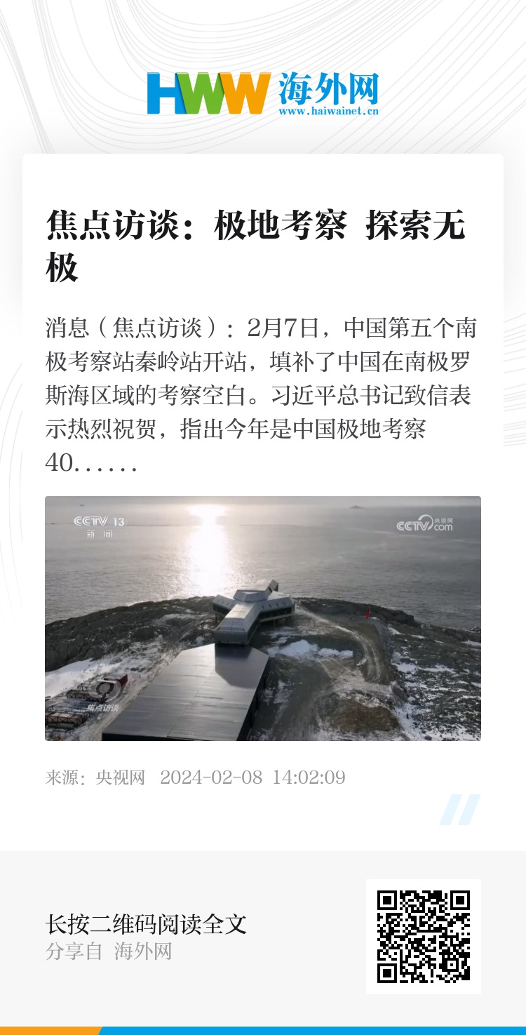央视网消息(焦点访谈):2月7日,中国第五个南极考察站秦岭站开站,填补了中国在南极罗斯海区域的考察空白。习近平总书记致信表示热烈祝贺,指出今年是中国极地考察40周年。40年来,在党的领导下,我国极地事业从无到有、由弱到强,一代代极地工作者勇斗极寒、坚忍不拔、拼搏奉献、严谨求实、辛勤工作,取得了丰硕成果。首先,我们来认识一下秦岭站。
