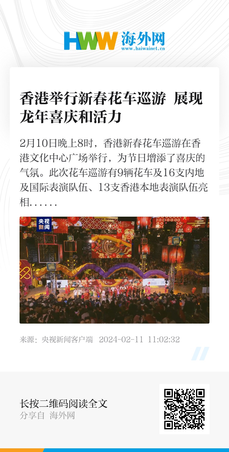 此次花车巡游有9辆花车及16支内地及国际表演队伍、13支香港本地表演队伍亮相。参与汇演的花车以“龙”为主题,寓意“龙跃在港”,而本次汇演参与表演的团队数量也是历年之冠,他们在巡游沿途奉上精彩纷呈的表演,展现龙年的喜庆和活力,为市民和游客带来一场文化盛宴。(总台记者 金东 冯良辰)