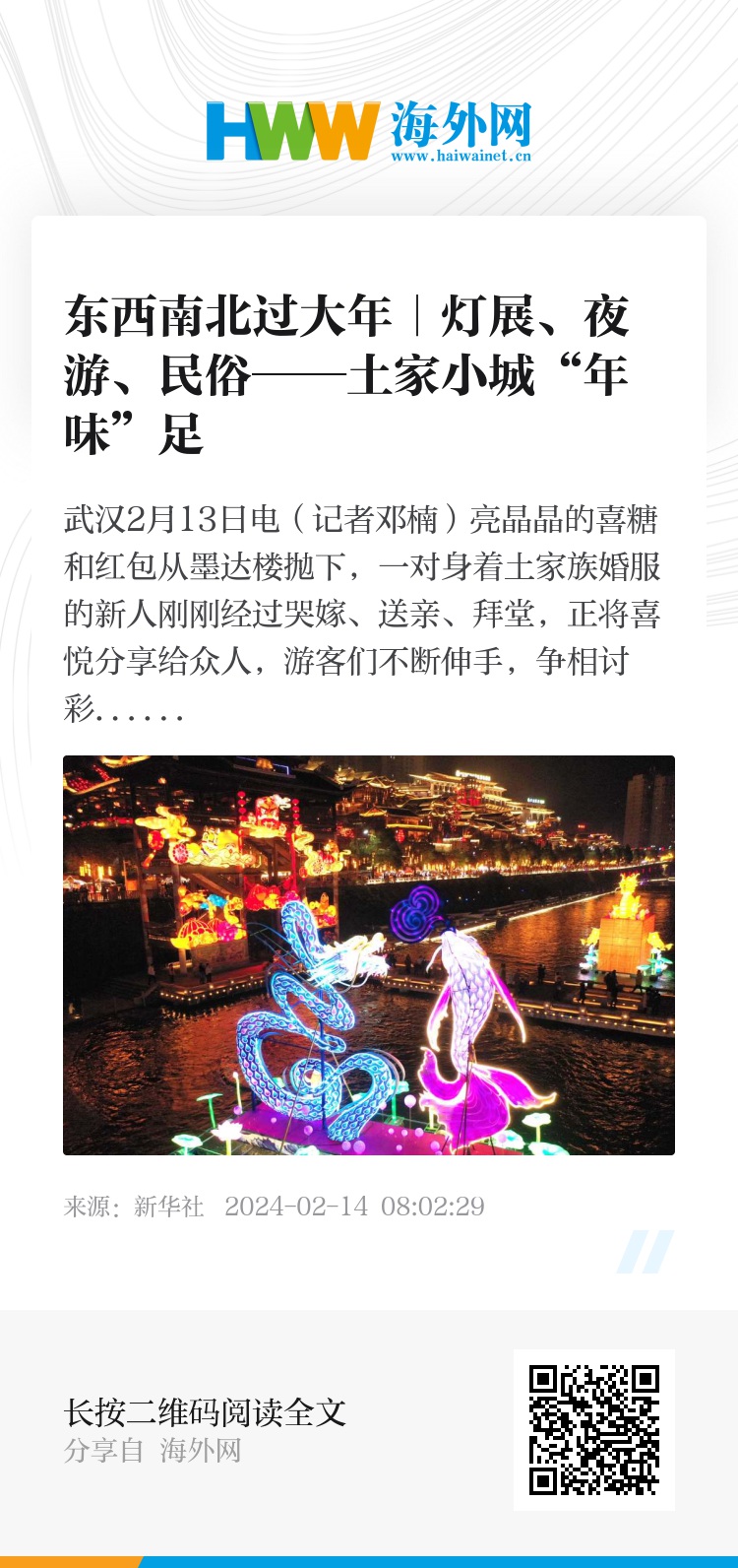 在湖北恩施土家族苗族自治州宣恩县,有一条贡水河穿城而过,持续多年的新春灯会如今引入非遗项目,增加游客沉浸式体验,成为传播民俗文化、赋能文旅融合的新方法。