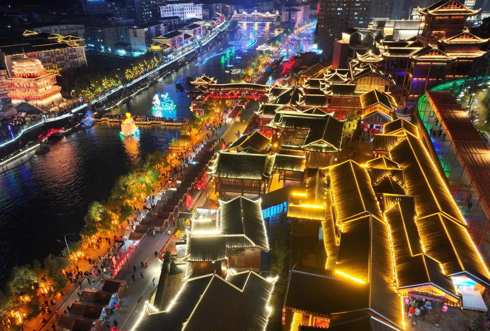 宣恩县贡水河两岸,灯光璀璨,游人如织(2024年2月12日摄)。新华社发(陈绪开 摄)