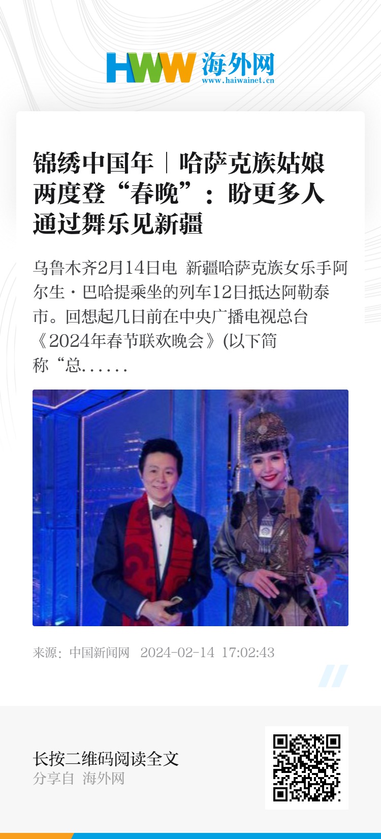 作为新疆阿勒泰地区歌舞团的一名乐手,阿尔生平日常随团赴乡镇演出。“新疆是名副其实的歌舞之乡,文化活动多且受民众欢迎。”阿尔生说,不论在多大的舞台,她都会通过乐器和表演展示出新疆的多彩文化。“我也会努力提升自己,如果有机会,还想再上春晚。”(作者 胡嘉琛)
