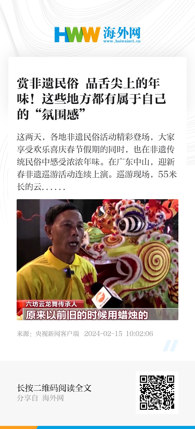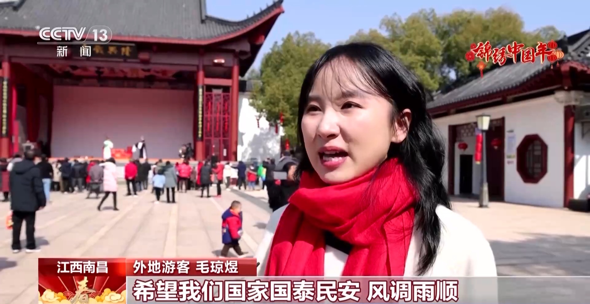 外地游客 毛琼煜:我是特地从外省过来过年的,看到了非常多的非遗传统文化表演。希望我们国家国泰民安、风调雨顺,希望我们老百姓的生活能够红红火火,更加幸福。