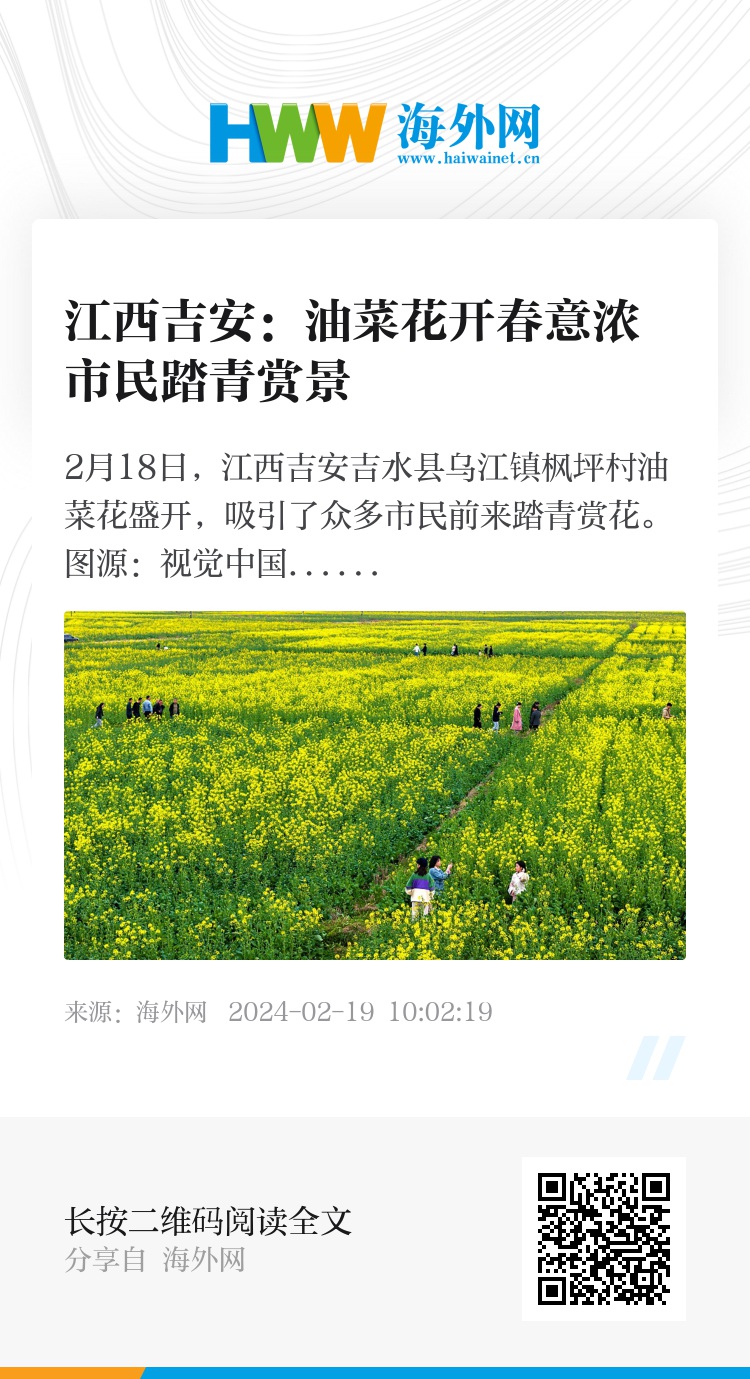 2月18日,江西吉安吉水县乌江镇枫坪村油菜花盛开,吸引了众多市民前来踏青赏花。图源:视觉中国