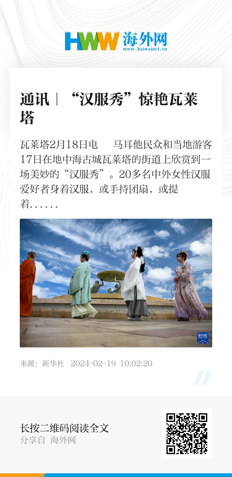 马耳他中国文化中心主任袁媛说,这场“汉服秀”以穿越千年的华服之美,欢庆中国龙年的到来,受到当地民众和国际游客热烈欢迎。“汉服秀”的成功举办也体现了中华文化的魅力和中西文化交流互鉴对促进民心相通、增进相互了解、加深友谊的影响力和推动力。(新华社记者陈文仙)