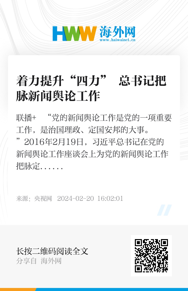 联播+ “党的新闻舆论工作是党的一项重要工作,是治国理政、定国安邦的大事。”2016年2月19日,习近平总书记在党的新闻舆论工作座谈会上为党的新闻舆论工作把脉定向,他强调要“切实提高党的新闻舆论传播力、引导力、影响力、公信力”。此后在全国宣传思想工作会议、党的十九大等重大场合中,总书记多次强调要着力提升新闻舆论“四力”。