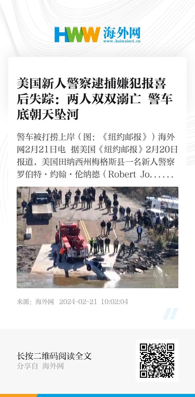 海外网2月21日电 据美国《纽约邮报》2月20日报道,美国田纳西州梅格斯县一名新人警察罗伯特·约翰·伦纳德(Robert John “RJ” Leonard, Jr.)完成首次逮捕嫌犯任务后向妻子报喜,然而隔天却被发现连同嫌犯一同溺亡。
