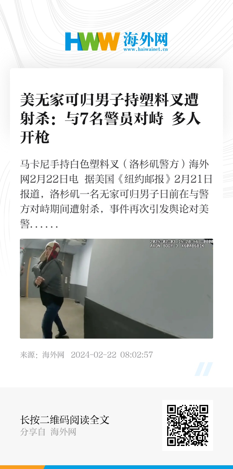 海外网2月22日电 据美国《纽约邮报》2月21日报道,洛杉矶一名无家可归男子日前在与警方对峙期间遭射杀,事件再次引发舆论对美警执法的关注。