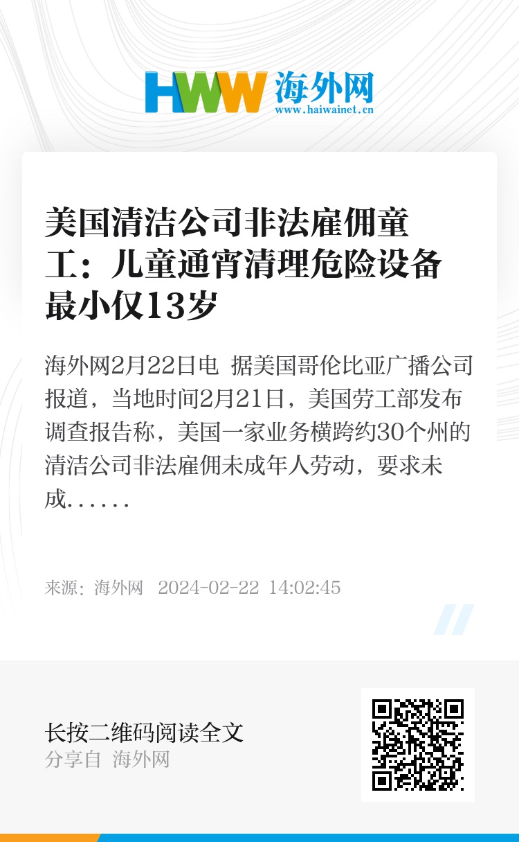 此案并非孤例,据美国有线电视新闻网此前报道,近年来美国国内非法雇用童工的现象激增,美国劳工部于2022年10月1日至2023年7月20日期间共审结765起童工案件,涉及4474名儿童,对雇主处以超过660万美元的罚款。与此前同期相比,非法童工数量增加了44%。此外,劳工部正在调查的童工案件还有700多宗,大多数涉及违反工作时长和从事危险工作等。(海外网 杨佳 实习生 游露)