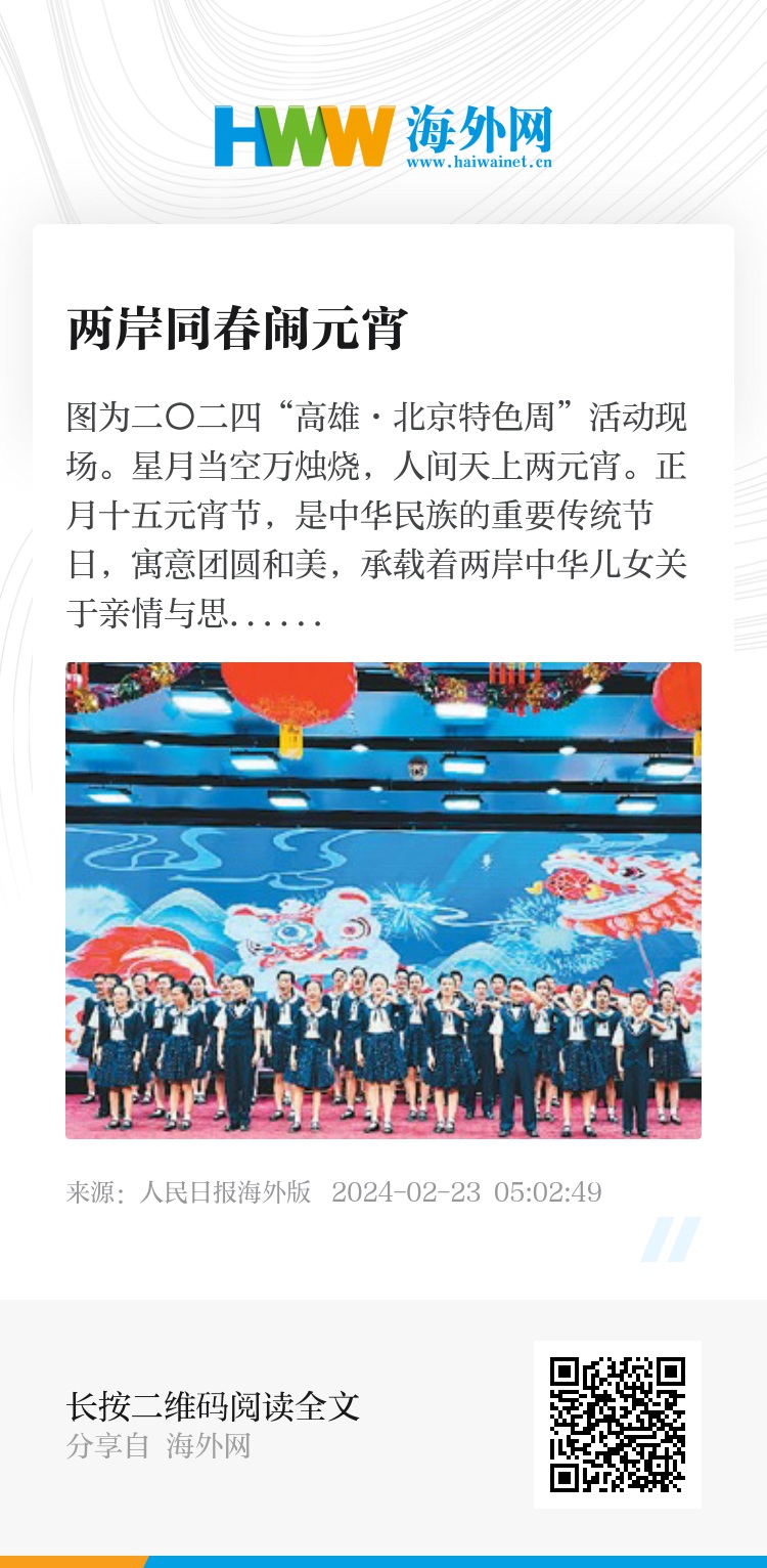 “在台湾,元宵节通常被人们视为‘年的收尾’,是春节最后的高潮。在我记忆中,吃元宵、做花灯、逛庙会,这些都是元宵节必不可少的活动。在大陆过元宵节,也有许多相同的习俗,一样隆重热闹。”北京协和医院台湾医生丁文蕴告诉记者,这已经是她和家人第二次参加“高雄·北京特色周”活动,这种和和美美、团团圆圆的氛围,感觉特别温暖。