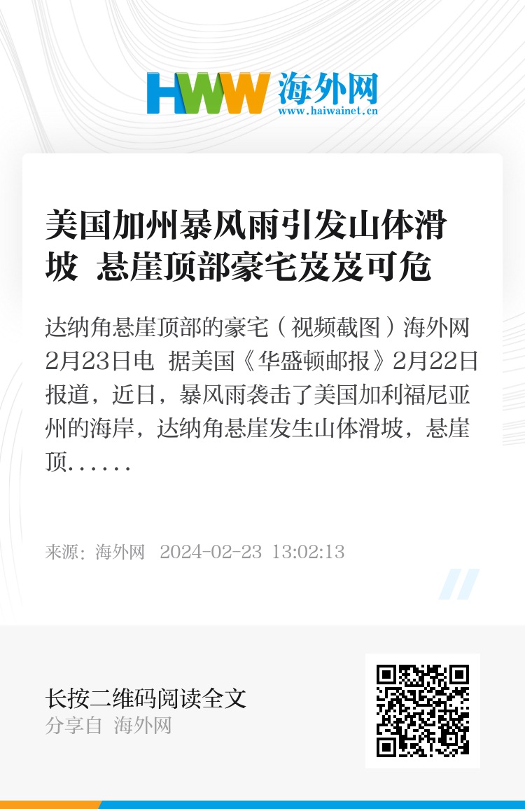 海外网2月23日电 据美国《华盛顿邮报》2月22日报道,近日,暴风雨袭击了美国加利福尼亚州的海岸,达纳角悬崖发生山体滑坡,悬崖顶部的三座豪宅岌岌可危。