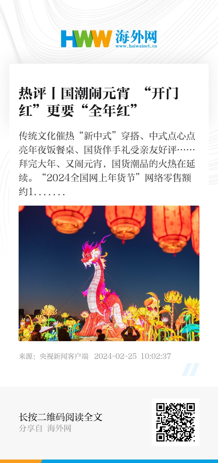 老字号焕发新活力,新国货拿出硬实力,“生生不息的民族文化、节节攀升的国货品质、源源不断的青年力量”,这是国货潮品深受喜爱的内在动力。“中国航天的每一步,都是向上的力量!”,今天(24日)我国新一代载人登月飞船命名公布为“梦舟”,大国重器引领“硬核国潮”,在元宵佳节令人更添底气和信心。