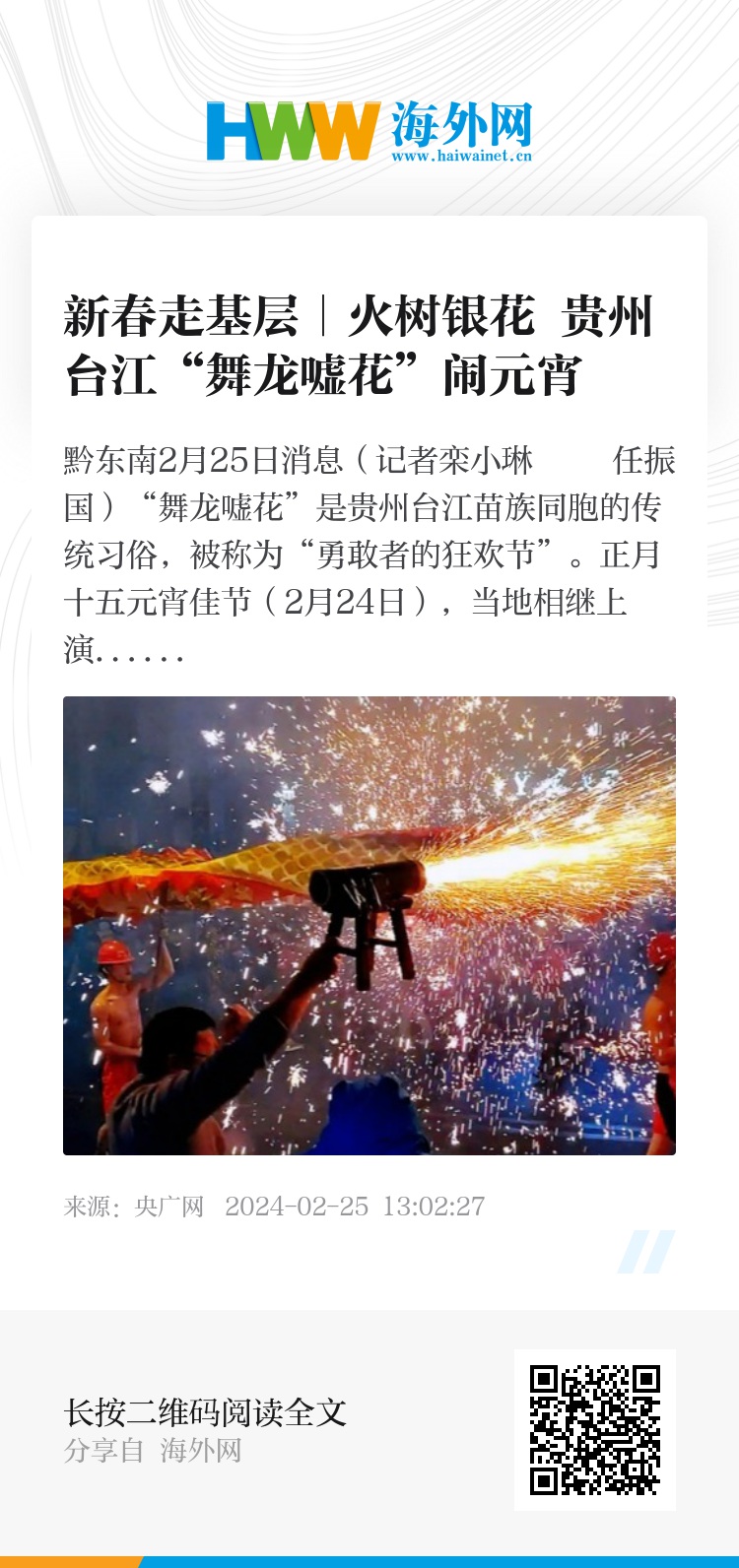 据悉,台江县是少数民族聚居的县城,其中苗族人口占98%以上,“舞龙嘘花”闹元宵习俗已保持有上百年历史。2021年,台江县“舞龙嘘花”已被入选为第五批国家级非物质文化遗产代表性名录。