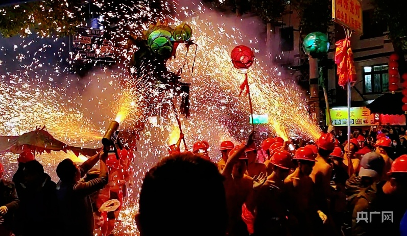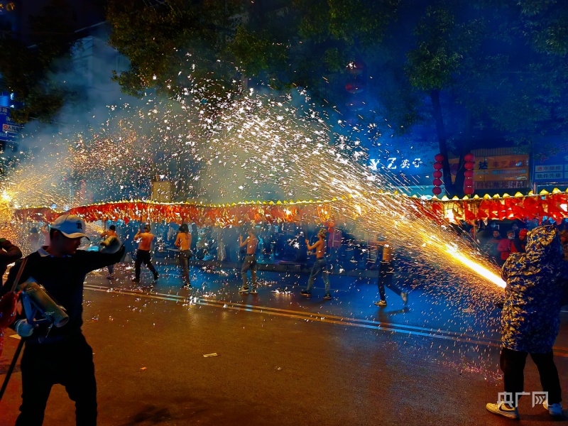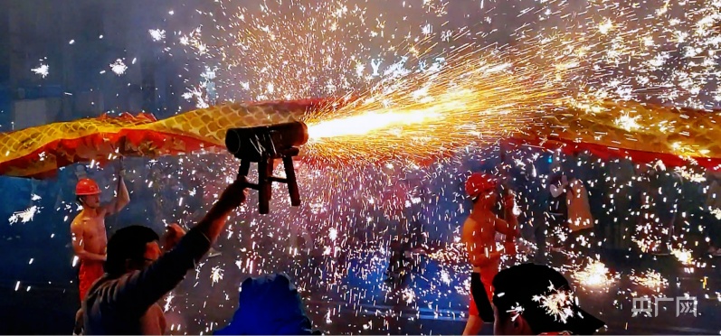 群众将自制的嘘花筒点燃对着长龙嘘花、喷洒(央广网记者 栾小琳 摄)