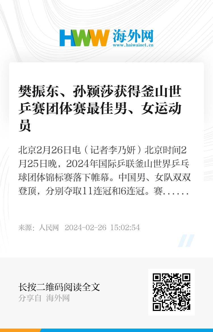 人民网北京2月26日电(记者李乃妍)北京时间2月25日晚,2024年国际乒联釜山世界乒乓球团体锦标赛落下帷幕。中国男、女队双双登顶,分别夺取11连冠和6连冠。