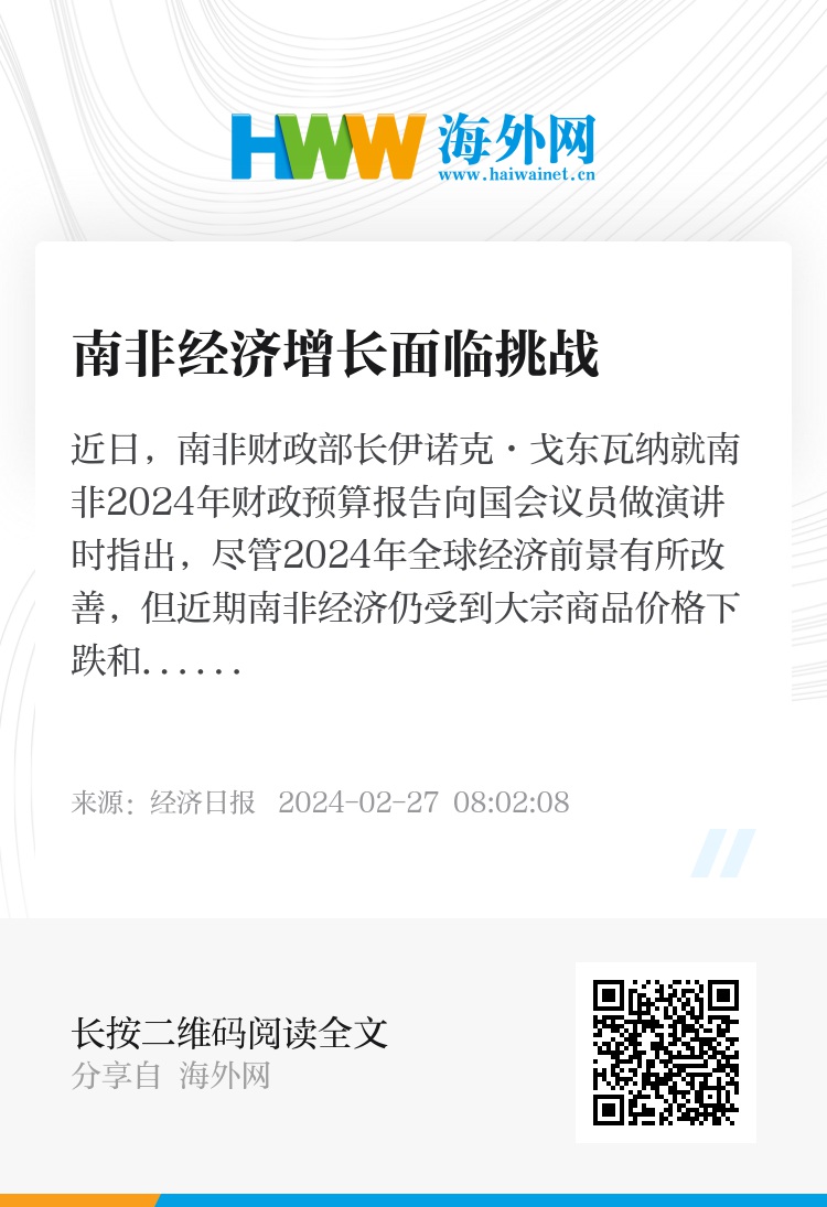 近日,南非财政部长伊诺克·戈东瓦纳就南非2024年财政预算报告向国会议员做演讲时指出,尽管2024年全球经济前景有所改善,但近期南非经济仍受到大宗商品价格下跌和结构性问题等因素影响。南非财政部预计2023年南非实际国内生产总值(GDP)增长率为0.6%,低于2023年中期预算政策报告预计的0.8%,这一修正是南非2023年三季度经济表现受家庭消费和固定投资双疲弱而低于预期的反映。
