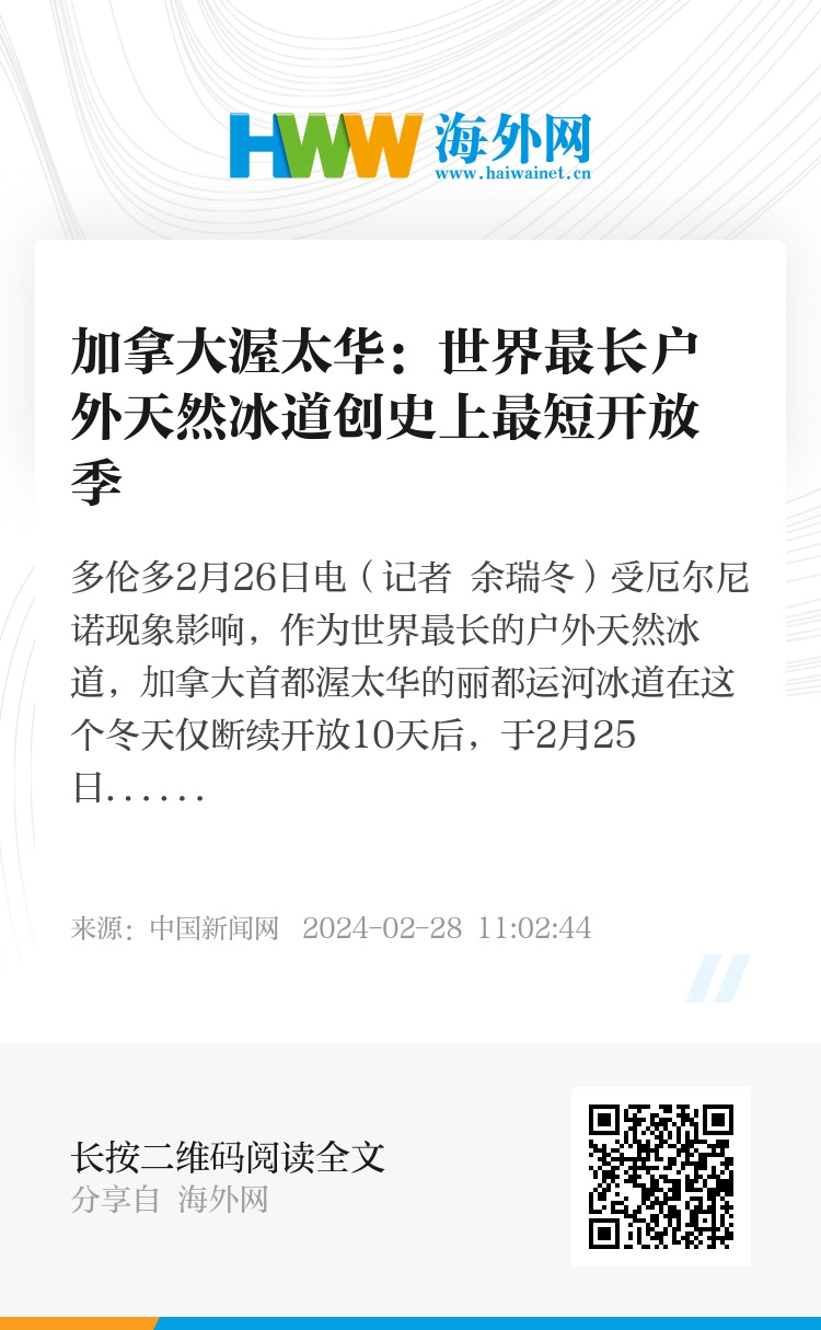 中新网多伦多2月26日电(记者 余瑞冬)受厄尔尼诺现象影响,作为世界最长的户外天然冰道,加拿大首都渥太华的丽都运河冰道在这个冬天仅断续开放10天后,于2月25日晚间关闭,匆匆结束本个开放季。