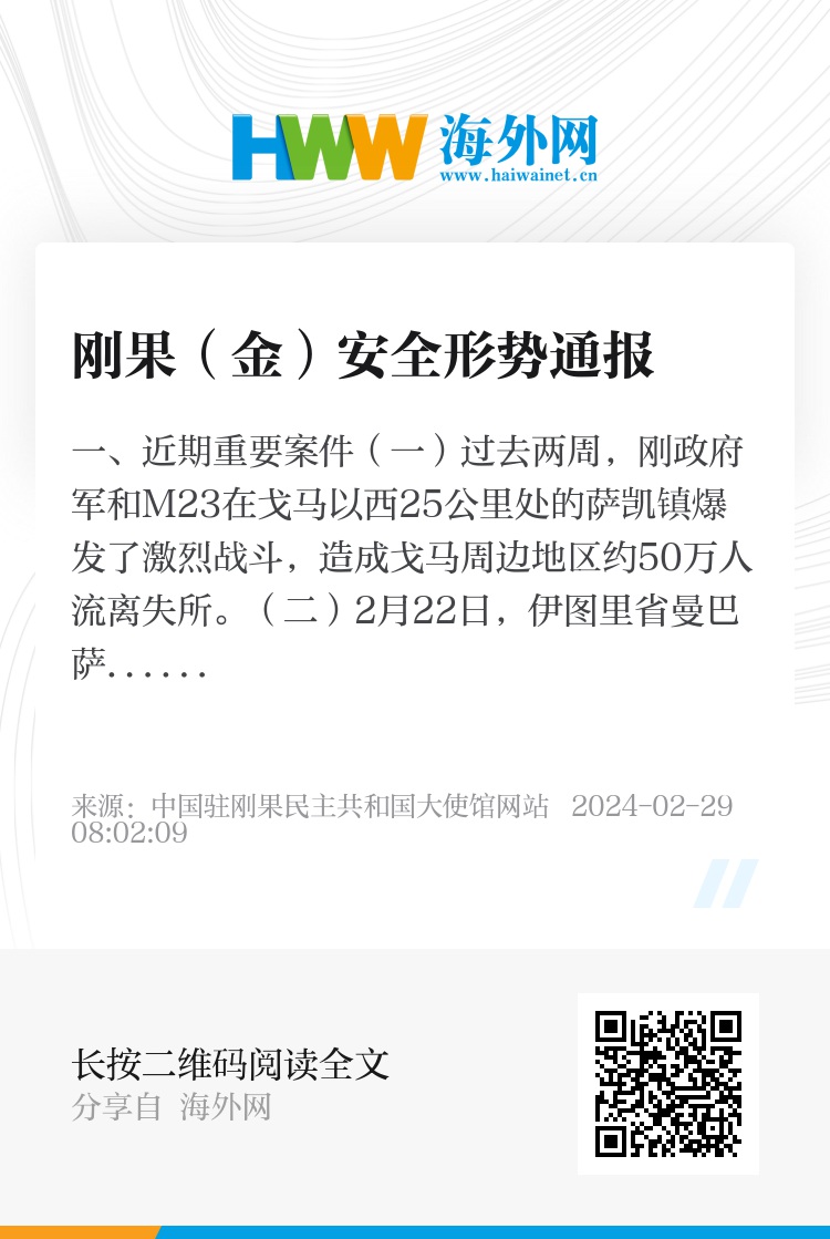 中国驻刚果(金)使馆提醒全体在刚中国公民坚决杜绝麻痹思想和侥幸心理,继续密切关注当地形势,加强安全防范。外出时请提高警惕,同身边亲友、同事保持联系,发现风险事态要及时规避。地处安全形势明显恶化区域的中资机构,请切实采取措施,继续以最高标准加大安保投入,压减非必要人员,做好突发事态下调整生产经营和人员安排的应急预案。谨慎前往热带传染病高发地带,必要时做好个人卫生防护。