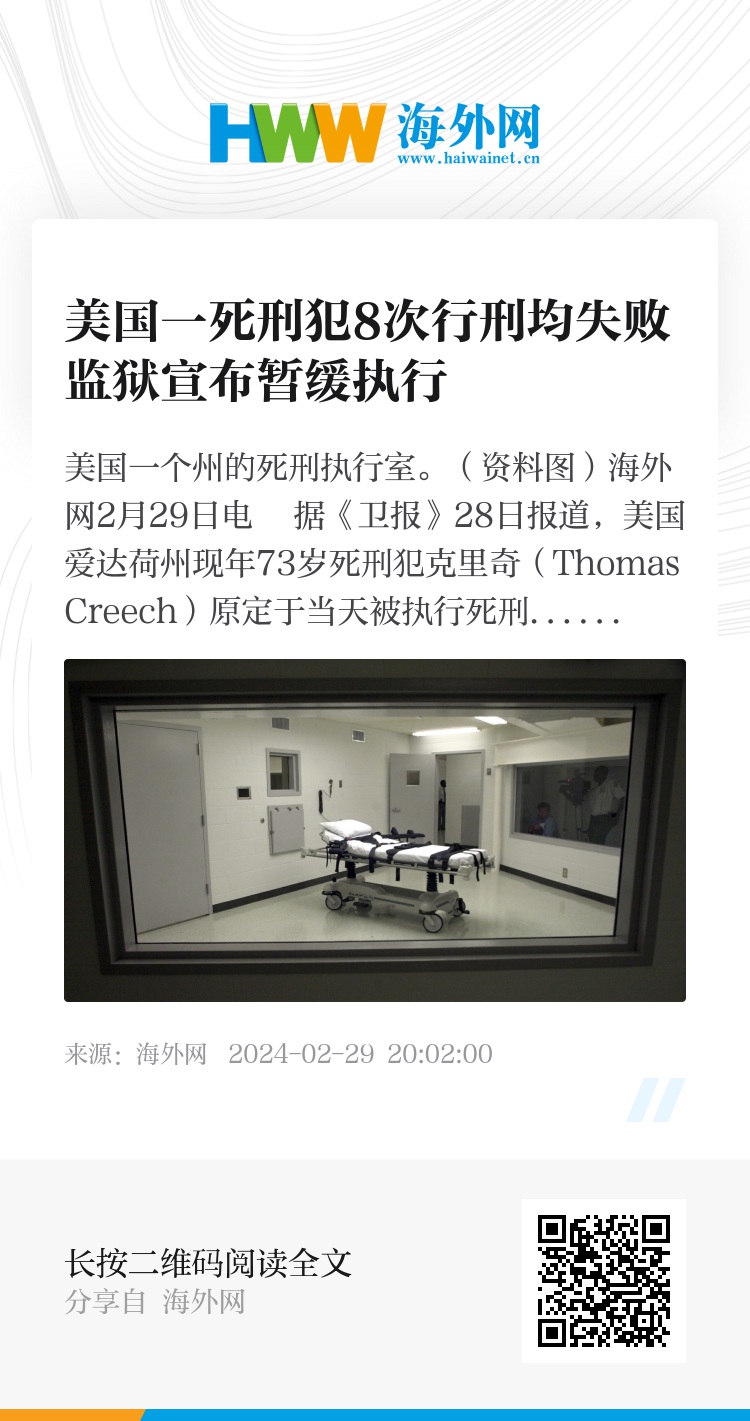 海外网2月29日电 据《卫报》28日报道,美国爱达荷州现年73岁死刑犯克里奇(Thomas Creech)原定于当天被执行死刑,没想到狱方却在他进入行刑室近1小时后宣布暂缓执行,因为医疗团队尝试8次静脉注射都失败。