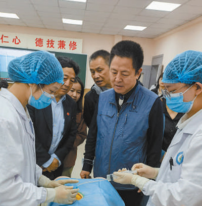 2023年4月26日,全国政协委员、中国医学科学院阜外医院麻醉中心主任医师敖虎山(右二)在四川省南充市南充卫生学校调研,了解学生临床操作情况。